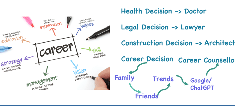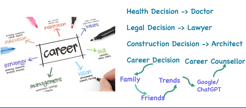 Approaching a doctor for your health concerns, a lawyer for legal matters or an architect for your construction needs is obvious, isn't it ? But when it comes to one of the biggest decisions of life — your career — many students and professionals still rely on family opinions, social media trends, Google searches or more recently, ChatGPT clues.